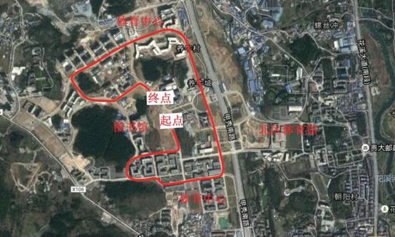 线路说明:阅湖广场(起点)--谨正楼--春风路--西楼--致礼路--潜龙路--材料与冶金学院--实训中心--土木工程学院--建筑与城市规划学院--明正楼--新区正大门--德正楼--崇学楼--崇厚楼--崇德楼--新区田径场--雅正楼--崇文楼--雅文楼--致礼路--崇义楼--致雅路口--育贤广场--致礼路--致达路--明俊楼--致诚北路--贤正楼--阅湖广场(终点),总路程约4.2195km。