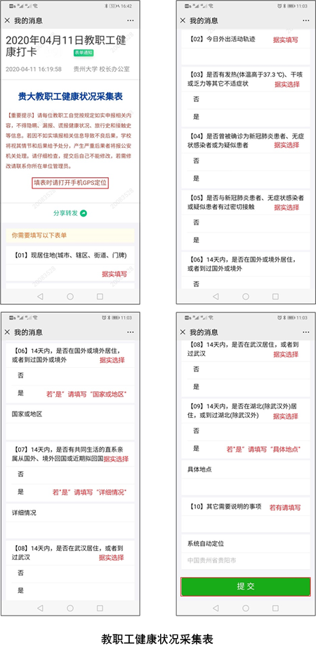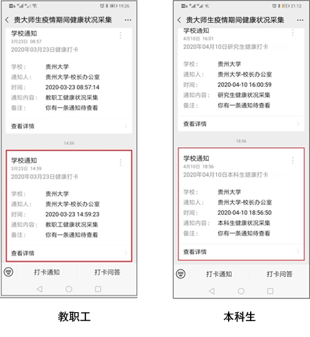 教职工从2020年2月22日(本科生从2020年4月15日)起至疫情结束,每日15时向“贵大师生疫情期间健康状况采集”公众号推送健康打卡信息,每日推送一次,用户在此公众号接收到学校通知后,才能操作打卡。请教职工于2月21日(本科生于4月12日)24时前领取激活校园卡,每日15时以后打卡。