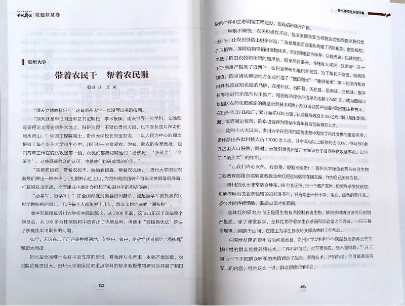 6月29日,由贵州省乡村振兴局、贵州日报当代融媒体集团联合编辑出版的《决战决胜脱贫攻坚“贵州战法”》系列丛书举行新书发布暨首发仪式。《贵州大学:带着农民干 帮着农民赚》一文被编入该系列丛书党建扶贫卷“贵州高校定点帮扶篇”。