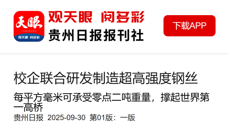 据了解,以此成果为基础,贵州大学与贵州钢绳股份有限公司正在省科技厅指导下,积极筹建贵州省特种金属线材全省重点实验室,致力于为更高强度、更大跨度、更加耐蚀的缆索研制提供技术支撑。
