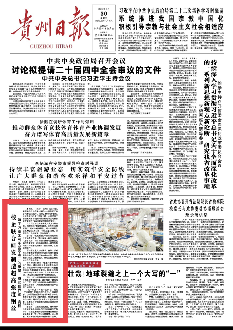 面对国家重大工程需求,贵州大学副校长向嵩教授领衔的科研团队与贵州钢绳股份有限公司实施产学研联合攻坚,最终成功实现核心技术创新,并将实验室成果转化为产业化应用。