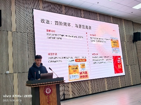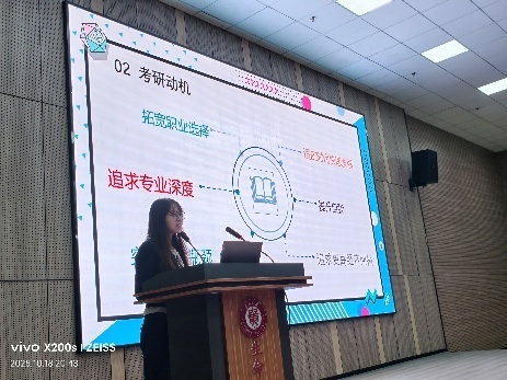 在考研学生经验分享环节,优秀考研学生代表结合自身备考经历,从目标确立、复习方法、心态调节等方面分享了宝贵经验,学生们的分享真挚朴实、催人奋进,充分展现了贵大学子勤学善思、勇攀高峰的精神风貌,也为学弟学妹们树立了榜样、传递了力量。