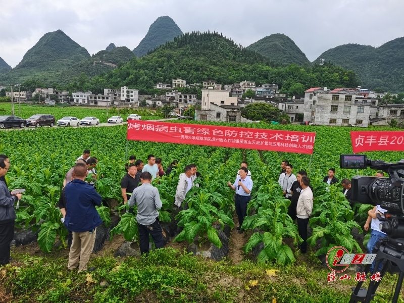 时下正值烤烟生长田间管理关键时期,做好病虫害防治将十分有益于田间中颗烟的长成,是“促增收、提质量”的有效手段。6月5日上午,贵州大学烟草学院院长杨茂发教授带领学院植保和栽培两个团队一行10人,到贵州大学对口帮扶的黔西南州贞丰县开展烟田管理技术培训,贞丰县烟草专卖局(分公司)局长谢培荣、副经理史广强及四十余名生产技术人员和烟农代表参加了现场培训会。此次培训内容包括“烤烟病虫害绿色防控”和“烤烟中后期田间管理”两个方面,目的是将烤烟绿色管护技术送至田间地头,助力贞丰县的烤烟生产。在纳山村烟地里,学院三位老师结合烟田实际,分别从烤烟虫害、病害及中后期田间管理方面进行了系统讲解。杨茂发教授就田间识别烤烟“三虫”与虫害绿色防控展开培训,主要向烟农及技术员介绍了烤烟的主要害虫种类、为害特点、发生规律及绿色防控的具体措施,还对我院与遵义市烟草公司共同开发的优效天敌昆虫产品——食蚜瘿蚊的田间释放技术进行了现场示范。桑维钧教授重点讲解了烤烟“三病”,同时就烟地里出现的病害详细地介绍了病因、田间症状以及绿色防治措施。高焕晔副教授就本年度烤烟种植中后期的田间管理技术展开培训,给烟农讲解了田间管理的“促”与“