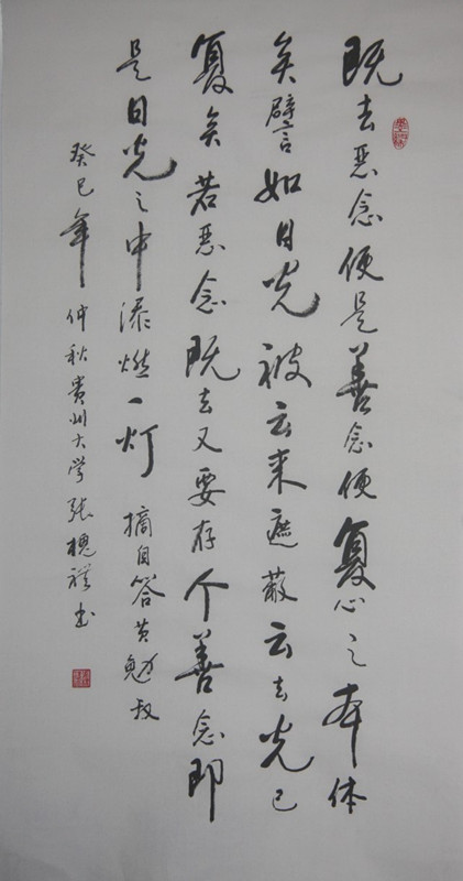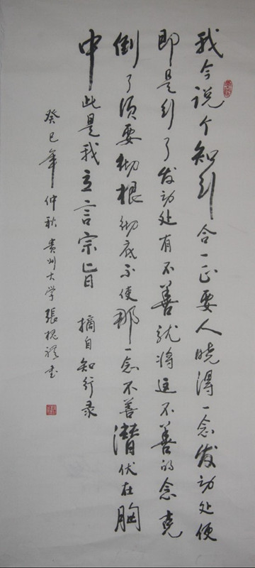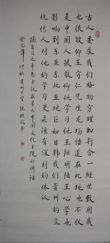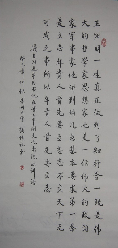 贵州大学退休教师张槐礼撰写书法作品赠与修文县人民政府。作品将在该县举行的纪念毛泽东诞辰120周年、阳明文化与清正廉洁、构建和谐书法展上展出。