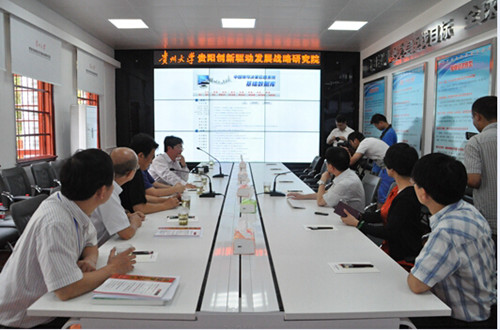 在贵阳创新驱动发展战略研究院,院长连玉明向秦斌一行介绍了党政主导的治理体系战略决策、组织架构、核心团队及学研融合的智库模式调研成果等。大家在会议室观看和了解了研究院制作的中国领导决策信息系统基础数据库、党政舆情检测系统、中央电视台视频数据库、网络工作平台、数字图书馆以及数据的整理与分析模式。