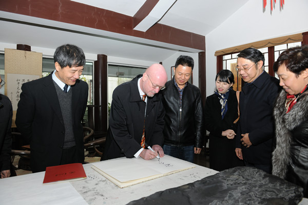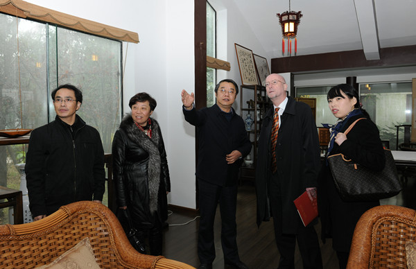 2014年12月5日,德国驻成都总领事馆总领事安介儒博士在贵州省教育厅党组成员、副厅长级督学杨勇的陪同下,参观考察贵州大学中国文化书院。贵州大学助理巡视员谢田凯、贵州大学国际交流与合作处周杰处长、谢明英副处长,贵州大学矿业学院院长张覃教授等陪同考察。
