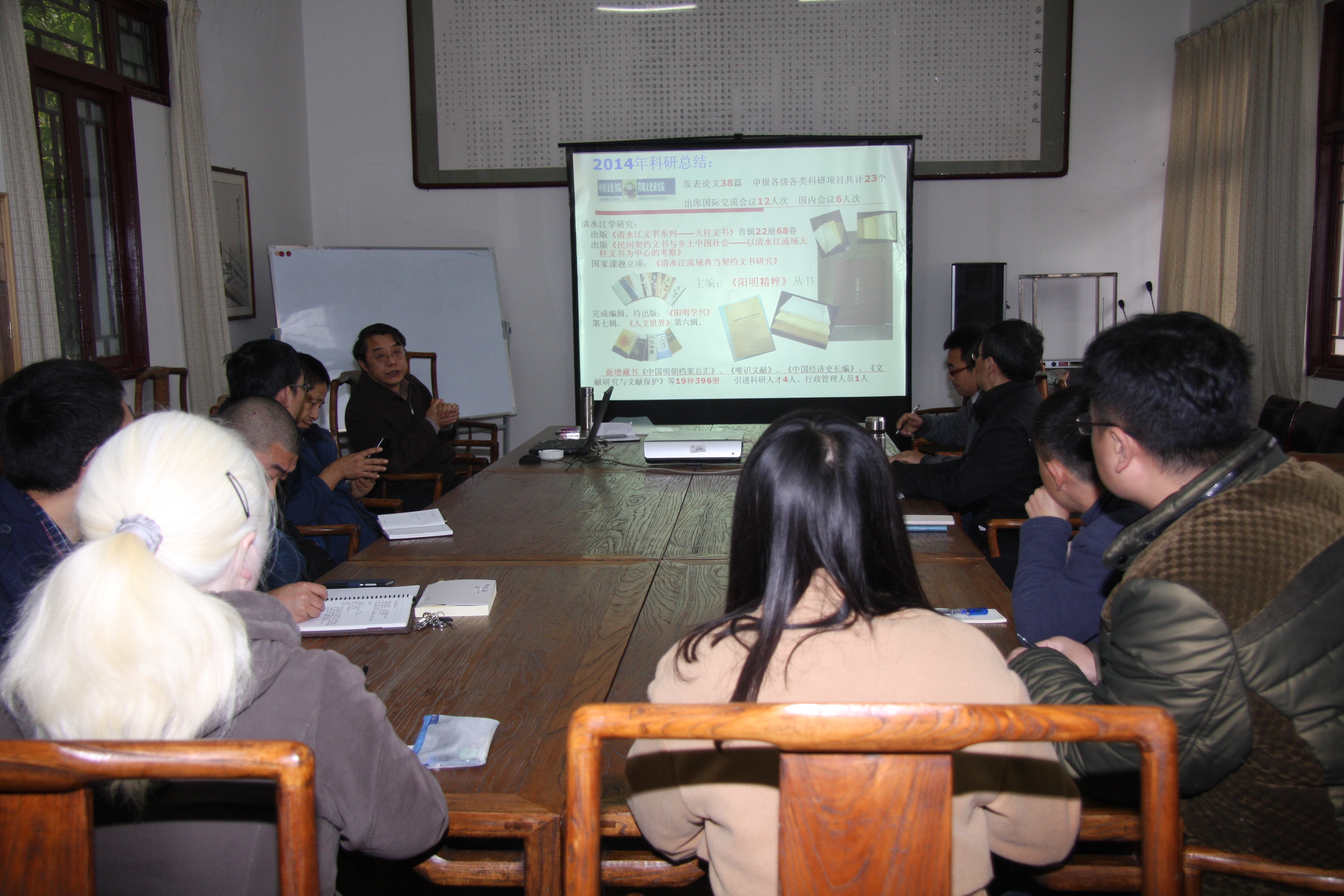 2014年全年,中国文化书院荣誉院长张新民教授主持的国家社科基金重大招标项目取得重大进展,出版《清水江文书系列——天柱文书》首辑22册68卷,由江苏人民出版社出版;由张新民教授等主编的《民间契约文书与乡土中国社会——以清水江流域天柱文书为中心的考察》、由张新民教授主编的《阳明精粹》丛书也已出版;一年中,书院新引进科研人员4人、行政管理人员1人;完成年度环境更新改造工作,购置新增《中国明朝档案总汇》、《唯识文献》、《中国经济史长编》、《文献研究与文献保护》等藏书19种396册;科研人员发表论文38篇,其中CSSCI刊物3篇;申报科研项目共计23个,其中国家级项目4个,省级科研项目1个,教育厅项目1个,学校级项目8个,基地项目9个;王凤梅副教授主持的“清水江流域典当契约文书研究”获得了国家社会科学基金一般项目立项;新进的四位博士分别还申请了校级“引进人才科研项目”;分别完成新一辑《阳明学刊》、《人文世界》征集稿件、审稿、组稿,编委会审定,待出版;2014年11月,为加强国内外阳明学研究,促进学术交流,由中国文化书院、中山大学人文学院、商务印书馆学术出版中心、《广西大学学报》(哲学社会科学版)等单位联合举办的“商务印书馆学术论坛·耿宁《人生第一等事》研究——王阳明及其后学论‘致良知’国际学术讨论会”,分两个阶段在贵州大学中国文化书院及贵阳市修文县召开。来自瑞士、中国大陆及台湾、香港等地的50多位学者参加了此次会议,提交论文20余篇。大会取得了圆满成功;2014年全年,科研人员出席国际交流国内学术会议18人次;先后有一系列重要学术与文化交流活动在文化书院举行。书院先后接待了各种参观访问250余批次,参观人员达三千余人,参观人员感受到了中国传统文化的魅力,受到传统文化熏陶。