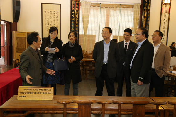2015年4月23日,国家自然科学基金委计划局孟宪平局长、国际合作局冯锋局长、王岩处长、方玉东处长、郝艳妮处长及刘卫处长一行参观贵州大学中国文化书院。贵州大学校长助理、科学技术研究院常务副院长许厚强、科研院副院长王爱华等陪同参观。贵州大学中国文化书院常务副院长张清、刘振宁副院长对孟宪平局长一行的到来表示热烈欢迎,中国文化书院刘振宁副院长、办公室罗旋主任带领客人参观书院孔子铜像、勉学堂、励道楼、涵远读书楼、仁文厅等处,详细介绍了中国文化书院的相关情况。