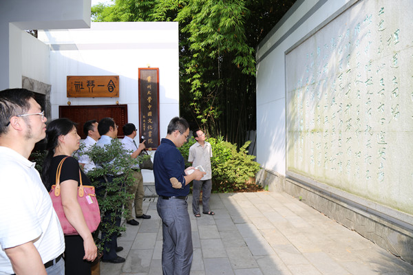 南京医科大学客人一行参观了书院孔子铜像、勉学堂、励道楼、合一亭、仁文厅等处。夏副校长饶有兴致地就贵州大学中国文化书院的学术研究、文化承载与传播等进行详细了解并提出了相关疑惑,张清常务副院长一一进行了回答和解释。