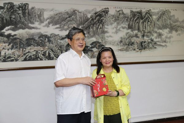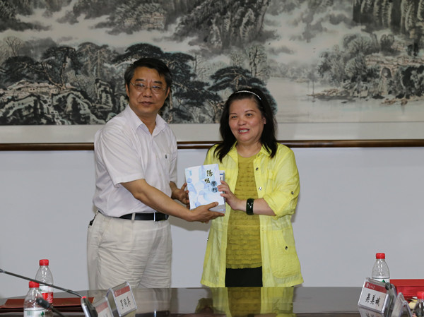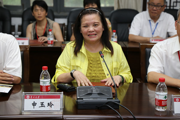 在港澳台办公室谢明英副主任一一介绍贵州大学参会人员、台湾贵州同乡会理事长申玉玲女士及访问团成员分别作自我介绍之后,校长郑强发表热情洋溢的讲话。他热烈欢迎台湾贵州同乡会、台湾贵州经贸文教交流协会申玉玲女士一行,介绍了学校近年来的学科建设、资金筹措、校区扩建特别是阳明文化研究院建设等发展情况。申玉玲女士对与郑强校长及各位新老朋友见面感到非常高兴,介绍了同乡会、交流协会此次返乡之行的主要目的与大致行程,希望与学校进一步开展文化教育等方面的交流与合作。