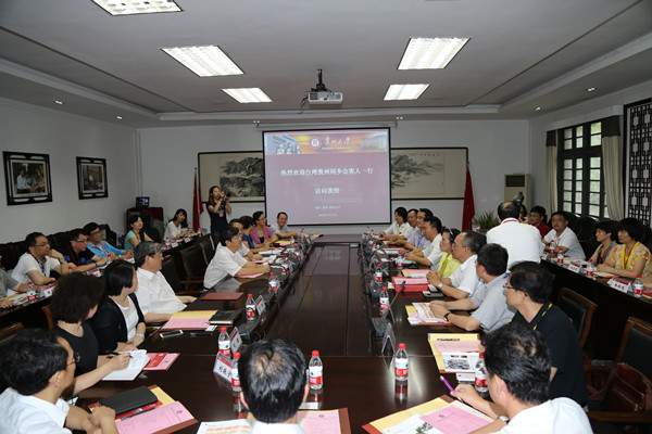2015年7月14日,台湾贵州同乡会、台湾贵州经贸文教交流协会一行29人在台湾贵州同乡会理事长申玉玲女士的率领下到校访问,并与贵州大学校长郑强、贵州大学中国文化书院等相关单位领导举行交流座谈。座谈会由贵州大学港澳台办公室副主任谢明英主持,贵州大学工会副主席周光琴、校长办公室副主任刘颖、港澳台办公室副主任吴静、港澳台办公室项目老师钟慧,贵州大学中国文化书院荣誉院长张新民、中国文化书院常务副院长张清、副院长刘振宁、副院长罗同兵参加交流座谈。