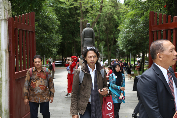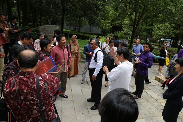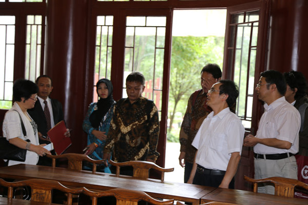2015年8月4日,印尼研究技术与高等教育部、印尼12所高校代表团及中国教育部留学服务中心官员一行26人来访我校,参观贵州大学中国文化书院。贵州大学郑强校长欢迎印尼代表团到来,并愉快地与代表团成员合影留念。贵州大学国际交流与合作处周杰处长、国际教育学院院长张成霞,贵州大学中国文化书院常务副院长张清、副院长刘振宁带领客人一一参观中国文化书院,并简要介绍了有关中国文化的情况。
