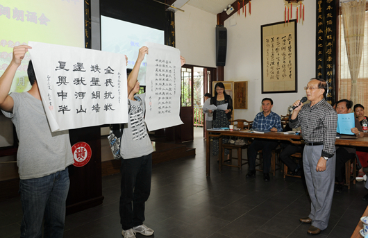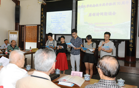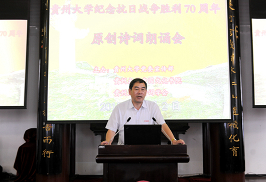 贵大新闻网讯(记者 丁龙/图 陈恒)为纪念抗日战争胜利70周年,弘扬在抗日战争中经过血火淬炼的中华民族精神,9月2日上午,由贵州大学党委宣传部、贵州大学诗词学会、贵州大学中国文化书院共同主办的“纪念抗日战争胜利70周年原创诗词朗诵会”在文化书院举行。校党委书记陈坚、副书记骆长江、校诗词学会名誉会长冯泽、贵州大学诗词学会的近百位诗友出席活动。