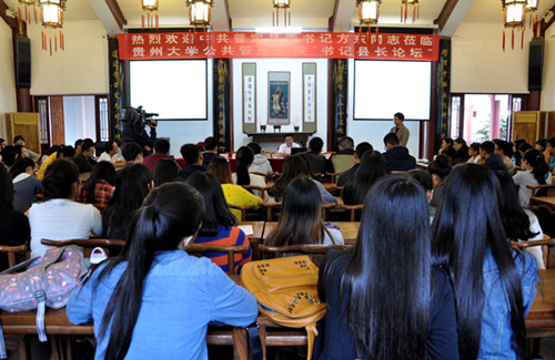 本网讯(新闻中心 实习记者 粟倩 报道|摄影李石磊)10月23日下午,应公共管理学院院邀请,中共普定县委书记方东在贵州大学勉学堂为我院师生作题为“扶贫攻坚:决战决胜的最后五年”专题讲座。公共管理学院党委书记李波,院长黄其松和100余名研究生、本科生和教师代表聆听了此次讲座。