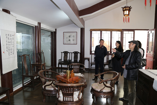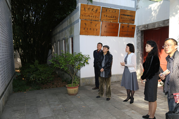 贵州大学中国文化书院办公室主任罗旋带领甘霖先生,先后参观了中国文化书院孔子铜像、贵州教育文化鼻祖尹珍塑像、贵山书院石刻以及勉学堂、游艺轩、励道楼、琴轩、合一亭、涵远读书楼、仁文厅等处;参观了原中国国家图书馆馆长任继愈先生及孔子第七十七代嫡传后人孔德成先生手书“中国文化书院”院名匾额,品读《书院赋》竹刻,欣赏毛泽东主席所亲笔题写“贵州大学”校名书法、陈立夫先生手书有关中国文化的书法大作以及日本前首相羽田孜先生的“温故创新”书法墨宝;品味当代贵州文化名人陈福同先生、戴明贤先生等的书法楹联作品以及当代书法家尉知先生手书书院学规与条规书法石刻、包俊宜先生《礼运·大同篇》书法石刻,欣赏中国明代伟大思想家王阳明先生手书“壮思风飞冲情云上和光春霭爽气秋高”书法楹联作品等。