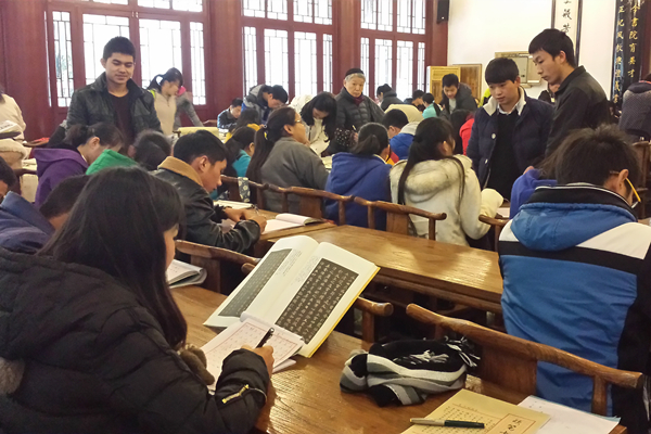 在书院勉学堂大厅,古德生院士一行还现场观看了学校书法协会学生的日常书法练习,听取了国家领导人视察书院、参与师生读书活动并发表重要讲话的情况介绍,了解习近平主席对贵州大学百年办学历史及人才培养的充分肯定并以中华优秀传统文化、王阳明“立德、立言、立功”三不朽勉励学校师生的情况。