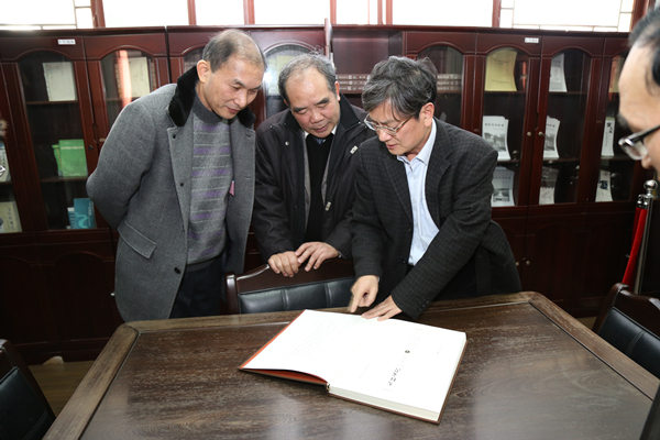 在书院科研成果陈列室,郑强校长向两位专家仔细介绍了“清水江流域文书”的研究情况及已经出版的《天柱文书》的重要价值。