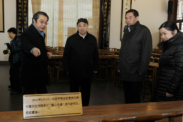 在书院勉学堂,杨志明主任还听取了国家领导人视察书院、参与师生读书活动并发表重要讲话的简要介绍,听取了习近平主席对贵州大学百年办学历史及人才培养的充分肯定并以中华优秀传统文化特别是以王阳明相关学说及其精神勉励学校师生的情况汇报。