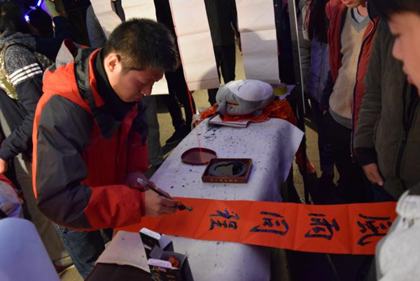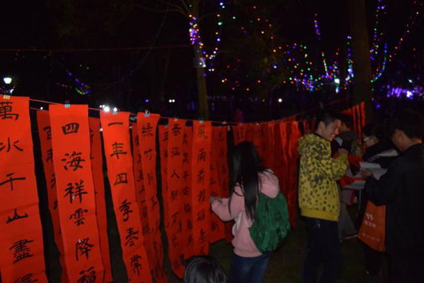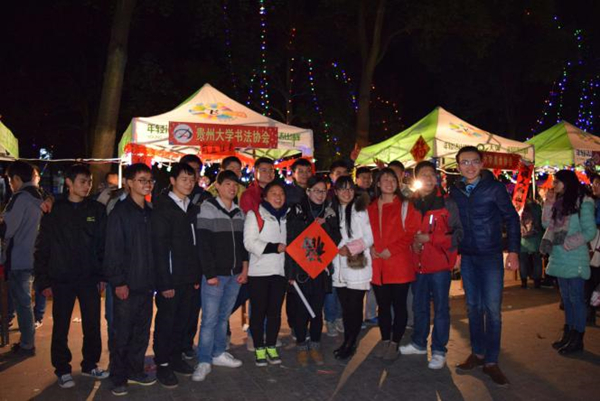 2015年12月31日晚间,贵州大学学生书法协会新老成员积极参与学校“元旦新春游园会”,在现场开展了“送春联,迎新春”的活动,赢得游园同学们的称赞和欢迎。