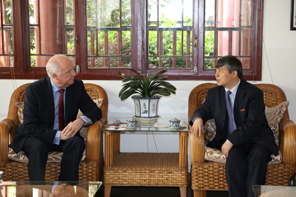 2016年4月6日上午,贵州大学副校长宋宝安在贵州大学中国文化书院会见了爱尔兰香侬酒店管理学院菲利普·史密斯(Dr. Phillip J. Smyth)校长一行。贵州大学国际交流与合作处处长洪芸,继续教育学院院长、中国-东盟教育培训中心常务副主任、中国—东盟教育培训联盟秘书长任康民参加了会见。