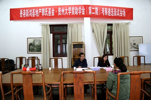 贵大新闻网讯 4月11日-12日,香港新鸿基地产郭氏基金•贵州大学奖助学金(第二期)考察遴选面试在北校区中国文化书院二楼会议室进行。香港新鸿基地产郭氏基金会主任吴宝琪女士担任面试官,学生资助管理中心社会捐助科韦国华老师陪同参加了面试。