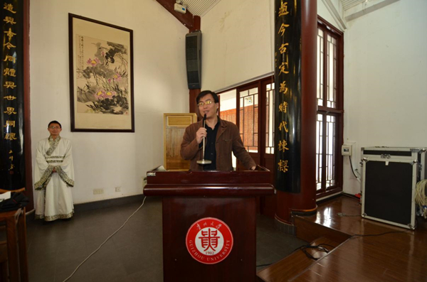 贵州大学中国文化书院荣誉院长张新民教授首先致辞。他首先表达了对此次活动的高度赞许,然后以传统书院“左学右庙”的功能设置为例,向大家详细讲解了礼乐文明的核心精神。他表示,在礼乐文明之中,人们通过祭祀活动感受圣贤活脱脱的生命,从而达到与圣贤的合一;当人们在礼仪中感受到这种价值世界以后,即使返回日常世界,也能够把日常世界价值化、文明化、礼乐化;或有人对中国文化存有一定偏见,认为我们没有宗教,然而我们的宗教是另外一种形式,它同样能够让人们感受到人的超越价值,并以衣冠文物、典章制度的形式保留下来。