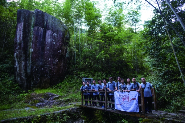 赣州市崇义县齐云山国家级自然保护区内,留有王阳明的纪功岩。图为采访团在纪功岩前合影。图片来源:《贵阳日报》2016年10月24日