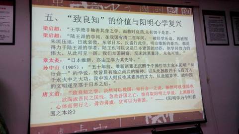 关于阳明心学的总体评价,张老师认为:阳明学在中国始终只是一种民间学说,没有在政治上产生巨大的影响,究其原因,是因为明朝中后期专制集权鼎盛、官僚政治腐败。虽然王阳明卓有远见,力求拯救明朝弊病,却由于时势逼迫,不得不多次辞官,阳明后学和后来的东林党都遭到打压甚至杀害,因此阳明学在中国是失败的命运。此外对“明之亡于王学”、王学空谈误国等说法,张老师表示不赞同。张老师说,明朝灭亡有其自身深刻的原因,不能怪罪于王阳明及其后学。接着,张老师以“日本国土面积狭小,为何能成为世界强国”这一问题引出明治维新与阳明心学的联系。这一部分张老师从中外名人的著述来介绍,首先是从孙中山、蒋介石、南怀瑾三位先生对日本明治维新的一些看法,接着说了日本学者西乡隆盛、高赖武次郎、冈田武彦等人对阳明心学于日本明治维新的作用的肯定。如西乡隆盛:“修心练胆,全从阳明学而来”;三岛由纪夫:“不能无视阳明学而谈明治维新。”他们都大力宣传阳明学、推动杨明学发展,将阳明心学在日本发展到极致。而美国学者杜维明的《宋明儒学思想之旅》也谈到了阳明心学对明治维新的影响:“五百年来,东亚儒家思想的源头活水,就在王阳明。”张老师认为阳明心学对明治维新起着重大作用,阳明心学是作为明治维新的根本首先动力。
