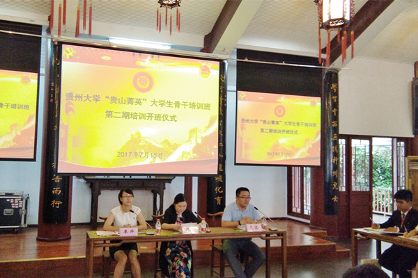 2017年7月15日上午,由贵州大学团委主办的“贵山菁英”大学生骨干培训班第二期开班仪式在贵州大学中国文化书院举行。贵州大学党委副书记杨未出席开班仪式并为培训班作“用青春拥抱时代”的开班第一讲。贵州大学团委主持工作副书记龙汶、副书记廖烨以及来自省内高校的100余名大学生骨干参加了此次开班仪式。