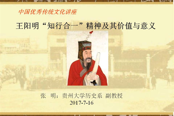 2017年7月16日,贵州大学历史与民族文化学院(中国文化书院)历史系张明副教授应邀赴贵州省六盘水市第三中学,为全校360余名教师作了题为“王阳明‘知行合一’精神及其意义与价值”的主题讲座。讲座分为四大部分:一、王阳明其人和所处的时代;二、龙场悟道:阳明心学的初步形成;三、阳明心学体系的内容与特点;四、“王阳明“知行合一”精神的其意义与价值。