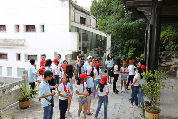 2017年7月24日下午,在贵州大学党委宣传部副部长石明昌老师带领下,参加由校党委宣传部承办的“同梦·同行”第三届贵州大学-香港大学教育文化双向交流活动的贵州大学、香港大学学生志愿者,以及两校志愿者开展暑期支教活动的贵州省榕江县寨蒿镇太平小学师生来到贵州大学中国文化书院参观。书院办公室工作人员在书院大门外热烈欢迎贵港两校学生志愿者及太平小学师生一行。