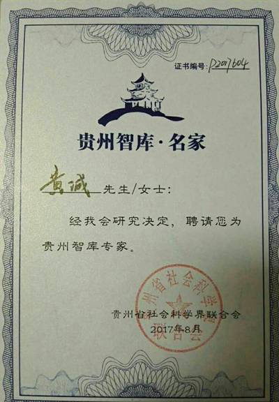 (贵州省社科联张秋涛副主任为黄诚教授颁发智库专家证书)