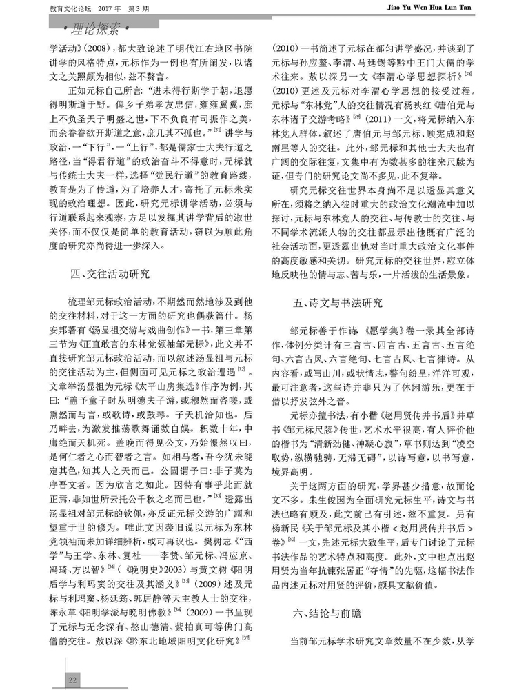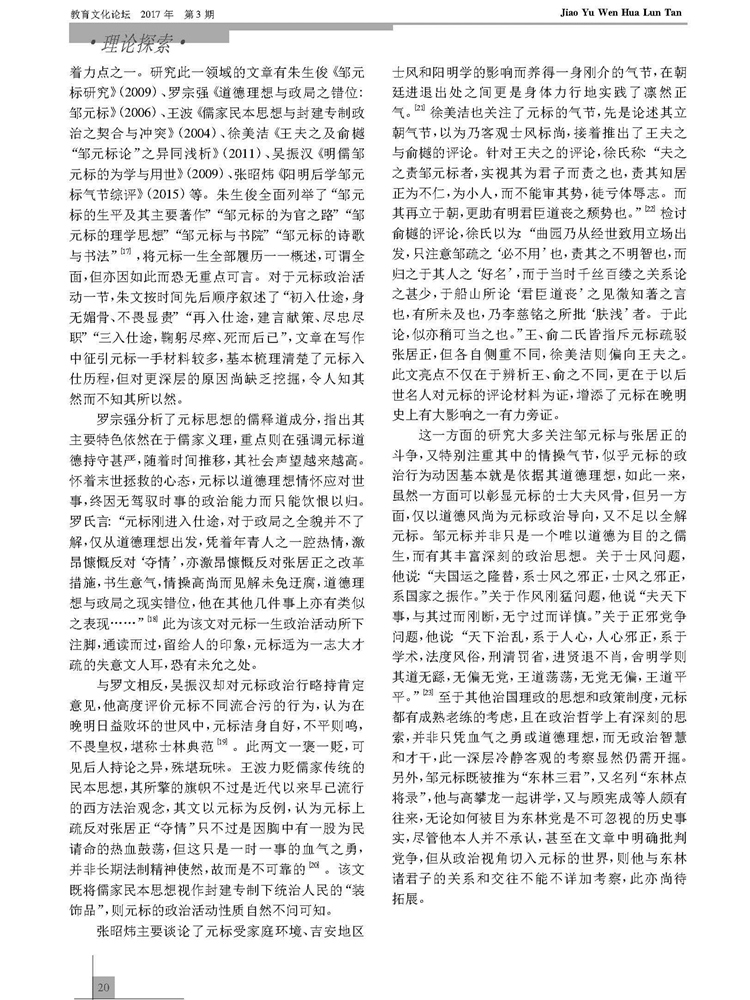2017年第3期《教育文化论坛》刊载贵州大学历史与民族文化学院中国古代史专业硕士研究生刘青衢参与贵州大学历史与民族文化学院(中国文化书院)历史系张明副教授所主持贵州省教育厅人文社科基地课题“黔中王门孙应鳌文献资料整理与研究”(2015JD001)、孔学堂2016年课题“阳明后学与《四书》注释研究”(KXTYB201602)成果,题:江右王门后学邹元标研究述略。全文如下: