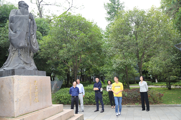 在书院门前,书院办公室研究生助理彭涛为客人们介绍了传达仁爱与和谐精神的孔子塑像,贵州汉文化教育的传播者、贵州教育文化鼻祖尹珍先生塑像以及见证贵州大学百年发展历史的“贵山书院”石刻。