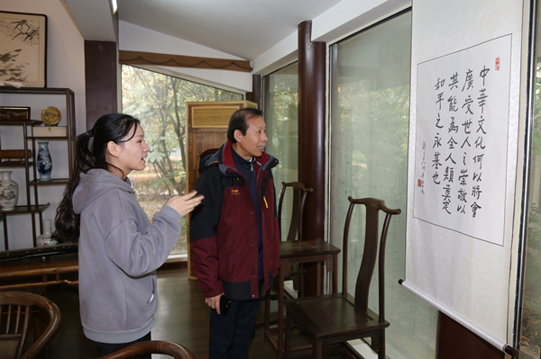 随后,客人们继续参观了体现“天人合一”、“知行合一”、“身心合一”、“道气合一”精神的合一亭、有着丰富藏书的涵远读书楼及读书楼下的学生之家,观赏挂靠书院的学生书法协会书法练习作品,考察取意“以文会友”、“以友辅仁”的仁文厅等处文化设施与陈列。