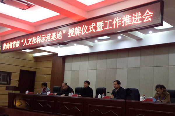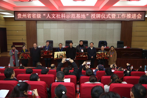 在授牌仪式暨工作推进会上,贵州大学中国文化书院以及六盘水师范学院“中国凉都文化研究创新中心”、贵州师范学院“贵州民族审美文化传播基地”、大方县委宣传部及文体广电旅游局“奢香博物馆”、遵义师范学院“红色文化研究中心”、黔南民族职业技术学院“民族文化传承创新与创业孵化基地”、安顺市第一高级中学“古槐文化传承创新发展中心”、贵阳市人民政府办公厅“贵阳创新驱动发展战略研究院”、贵州省图书馆、贵州民族大学“民族地区社会治理创新研究基地”共十家单位和机构,获2017年省级“人文社科示范基地”命名授牌。
