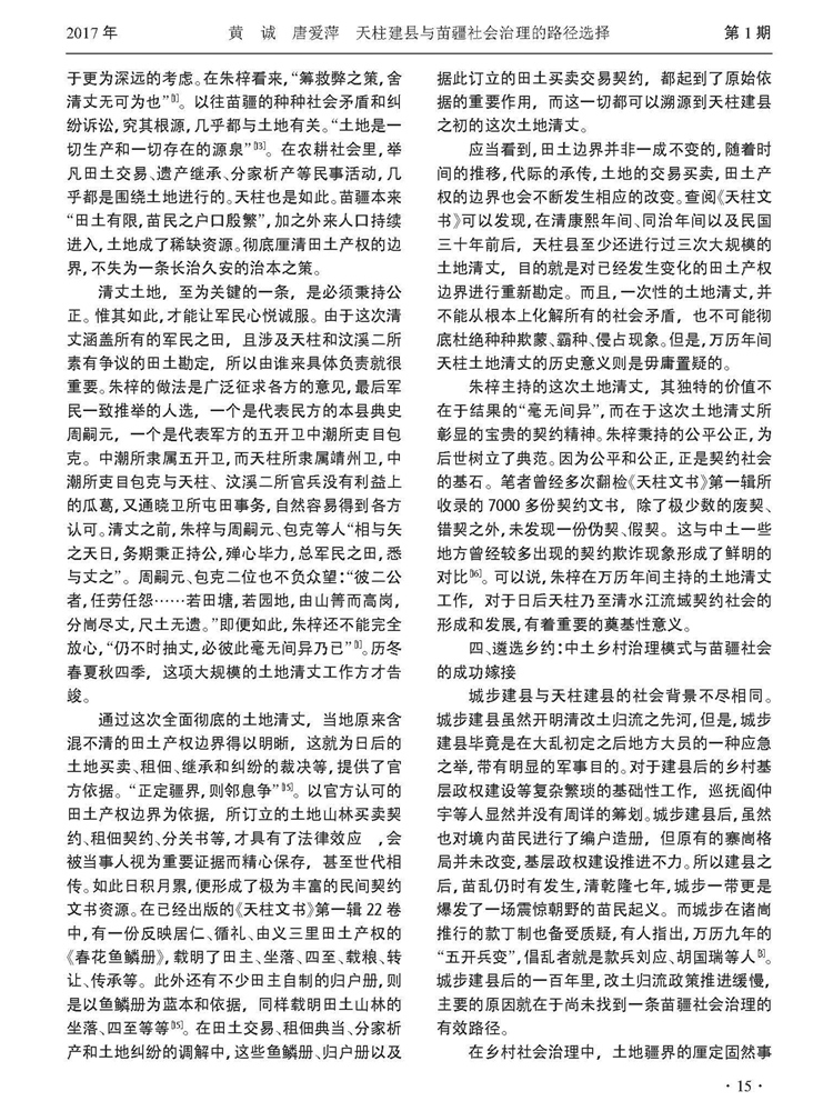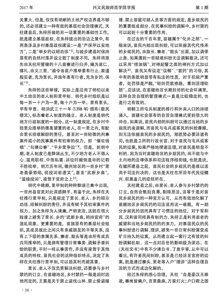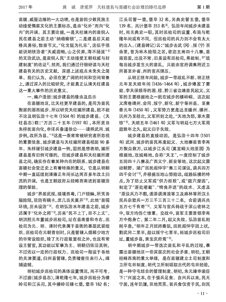 2017年2月第1期《兴义民族师范学院学报》刊载南京大学历史系博士后、贵州大学中国文化书院教授、中华传统文化与贵州地域研究中心研究员黄诚以及南京大学文学硕士、江苏人民出版社编审唐爱萍2014年第56批中国博士后科学基金面上一等资助项目(资助编号:2014M560413)、2011 年度国家社科基金重大项目(批准号:11&ZD096)研究成果,题“天柱建县与苗疆社会治理的路径选择”。全文如下: