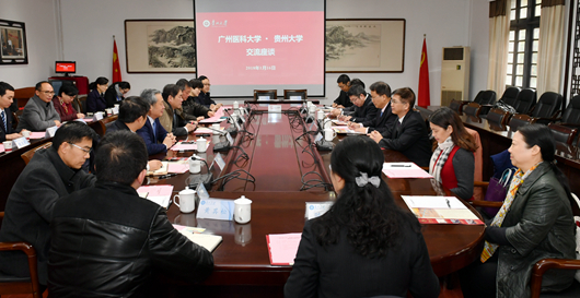 陈坚与王新华分别代表贵州大学与广州医科大学签订《广州医科大学帮扶贵州大学医学院战略合作协议》。随后,双方围绕我校医学院发展战略、办学规模、师资培养、实验室建设等话题展开交流座谈。