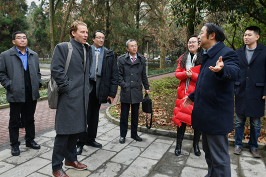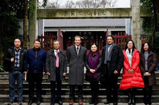 在贵州大学党委副书记杨未及校国际交流与合作处长洪云陪同下,到校访问的加拿大驻重庆总领馆总领事戴杰豪(Jeff David)一行于1月16日上午参观贵州大学中国文化书院。中国文化书院负责人及办公室工作人员对戴杰豪总领事一行到来表示热烈欢迎,向总领事一行介绍了中国文化书院的历史发展与现状、书院内外中华优秀传统文化标志性设施与陈列。