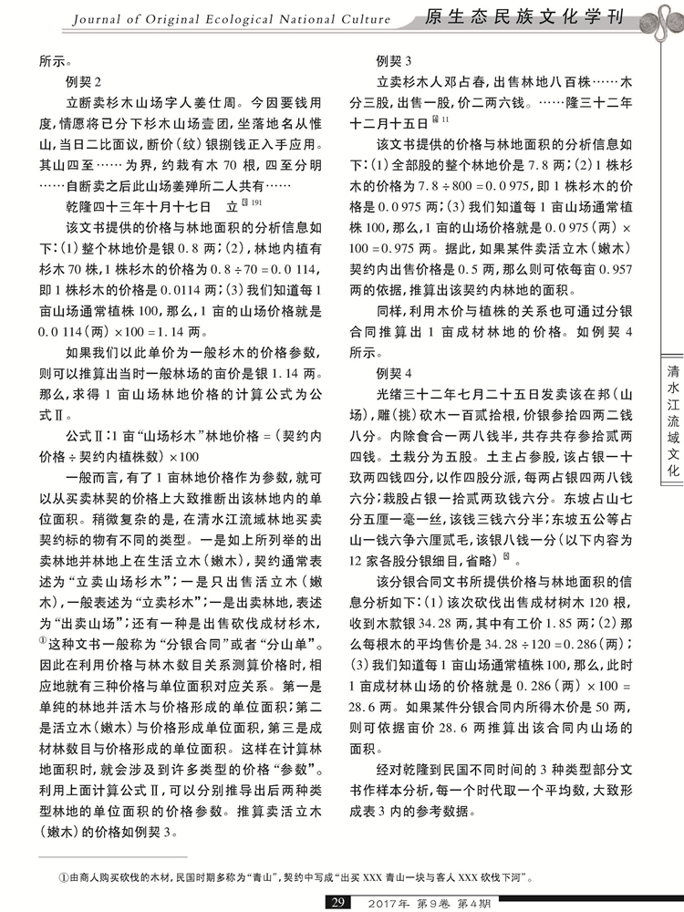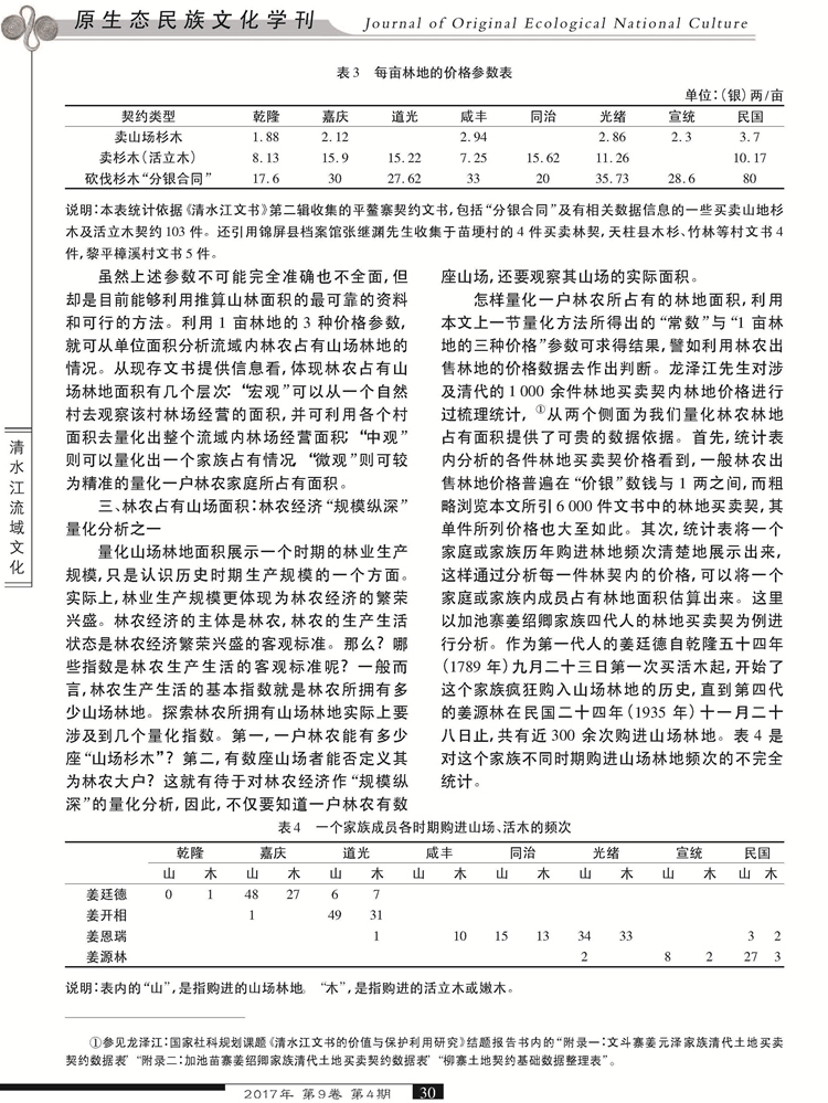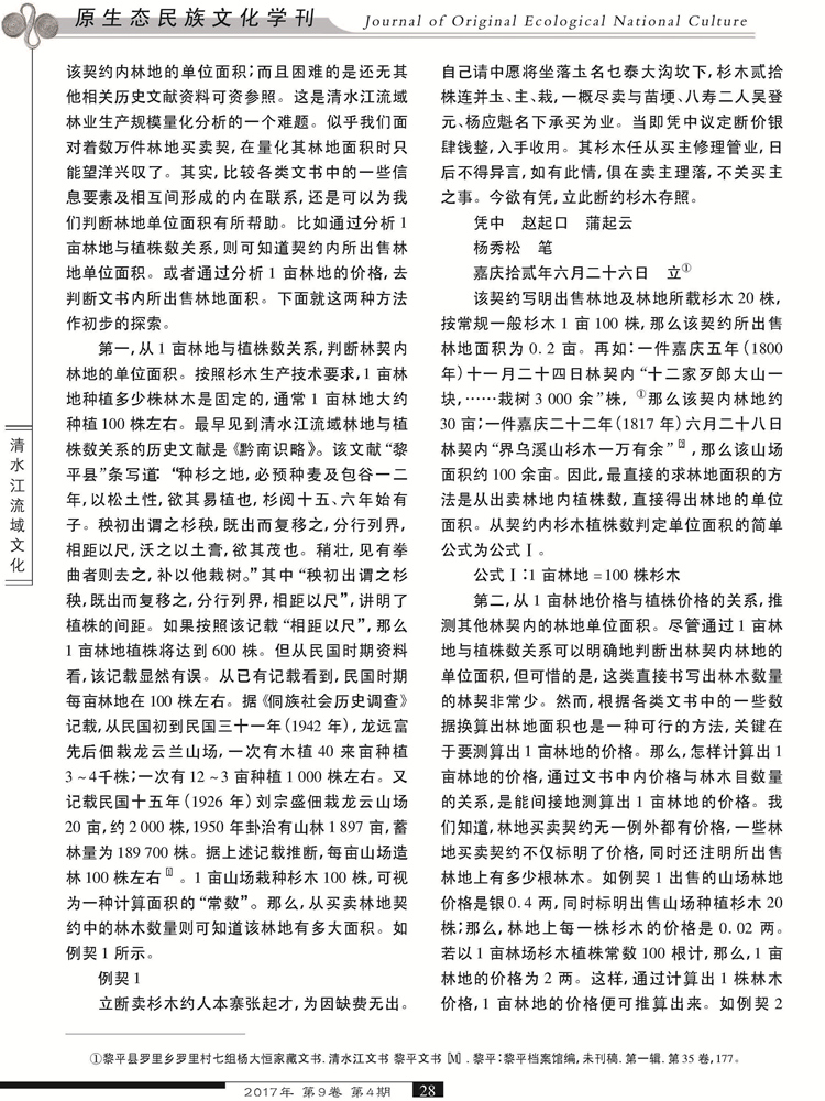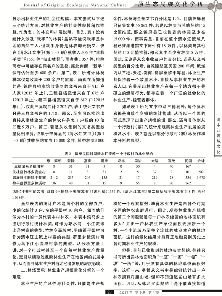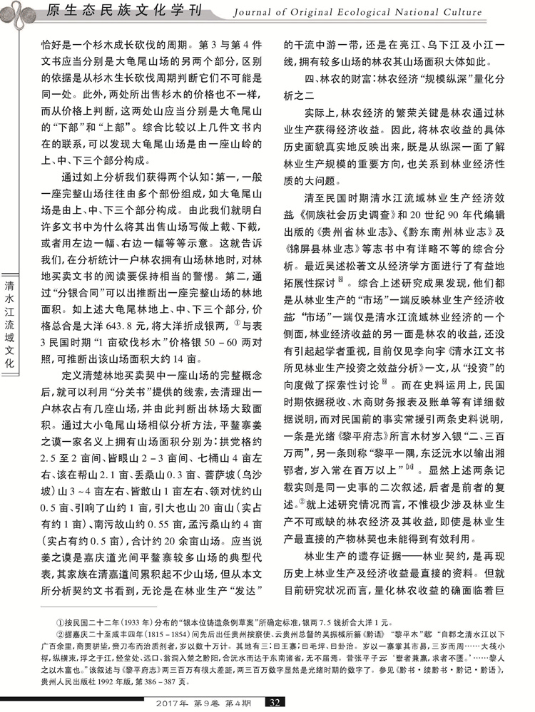 2017年第9卷第4期《原生态民族文化学刊》刊载贵州大学历史与民族文化学院(中国文化书院)历史系、贵州大学“清水江研究中心”研究人员林芊教授及历史系硕士研究生杨春华国家社科基金一般项目“晚明至民国时期内地侗、苗民族地区土地买卖与地权分配研究”(14BZS069)、国家社科基金重大项目“清水江文书整理与研究”(11&ZD096)研究成果,题:清水江林业契约与林农经济史的量化关系研究。全文如下: