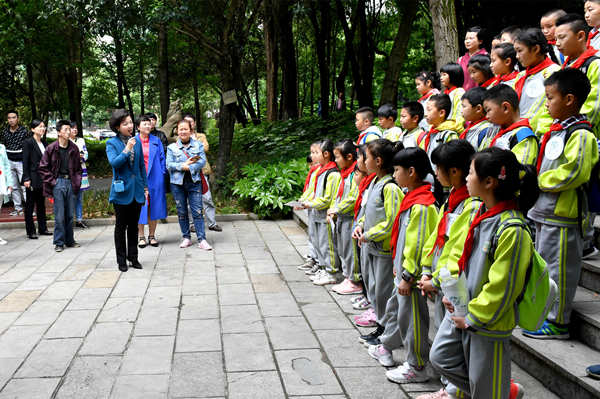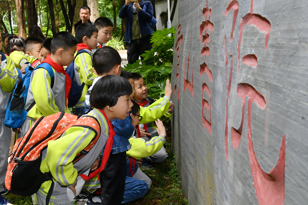 在书院大门外,小朋友们听书院办公室助理沈继发大哥哥讲解孔子塑像的文化含义。看到中国古代伟大的思想家、教育家孔子作致礼状的高大形象,小朋友们近距离感受到了中国传统文化的仁爱、和谐、神圣、庄严。在贵州教育文化鼻祖尹珍先生塑像前,当听到尹珍先生年轻时即远赴中原学习、回到贵州家乡兴办学校传播文化的故事,小朋友们纷纷围拢上来细细观看。在“贵山书院”石刻前,小朋友们近前抚摸着承载岁月沧桑的字迹、感受贵州家乡文化教育发展变迁。