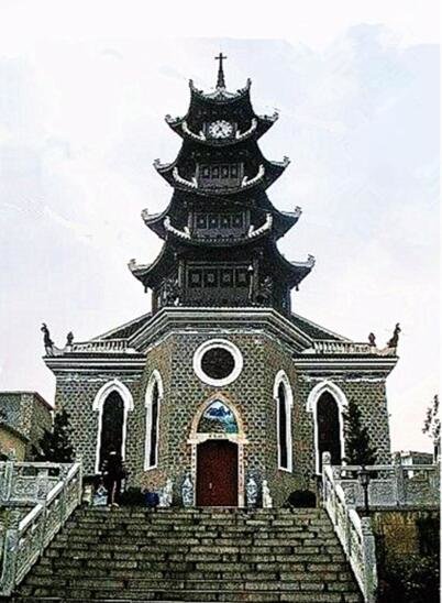 这种中西合璧的天主教堂建筑在贵州城市天主教堂建设中运用较多,如贵阳北天主教堂、南天主教堂,安顺天主教堂,湄潭天主教堂等。其中,贵阳北天主教堂始建于1798年,1874年重建,历时两年建成。工程由法国传教士毕乐士负责,他遍访中国建筑专家,最终确定了中西合璧的天主教堂建筑形制——教堂前部为中国徽派马头墙式牌坊,中部为西方哥特式建筑,后部为中国塔楼式钟楼。建筑师巧妙地融汇三种不同风格的建筑,使正面的牌坊与中部穹窿及后部钟楼实现自然过渡,复杂的空间造型得以融为一体,展示了和谐统一的空间美。尤其是后部总高32米的中国塔楼式钟楼,其六角四重檐青筒瓦攒尖顶建筑,为教堂增色不少。贵阳北天主教堂创造了既是中国化的又是贵州独有的中西合璧天主教堂建筑形制。该堂一经建成,随即名扬中外,曾被法国制成明信片和邮票向全世界发行。