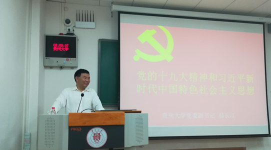 骆长江副书记先给同学们回忆了习近平总书记在2011年5月9日来到我们贵州大学时的场景,当时作为联络员的他,把每一个细节都深深印在了脑海里。接着,骆书记说,十九大报告是有史以来内容最丰富,篇幅最长的大会报告,习近平总书记花了3个半小时才报告完,在史上也是绝无仅有,所以十九大报告的地位不言而喻。接下来,骆书记从十九大报告的主题、习近平新时代中国特色社会主义思想的历史地位、“八个明确”、“十四个坚持”等方面向我们详细深刻地传达了十九大精神。骆书记说,我们现在正处在全面建成小康社会的决胜阶段,也是中国特色社会主义进入新时代的关键时期,但现在尚有几千万群众还未脱贫,要完成这个目标还需我们不断努力。我们现在还要高举中国特色社会主义的伟大旗帜,不忘初心,牢记使命,为人民谋幸福,为民族谋复兴。