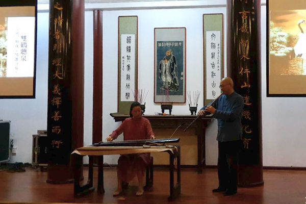 赏着那《中秋月》,更是忆起那远方的故人。琴社社长晏忠涛一曲《四月八》,表现了苗族同胞欢度佳节的喜庆。欢快而富有民族气息的《四月八》,将听众从那哀思中抽离,仿佛置身于苗族同胞成群结队、华服盛装、载歌载舞欢度节日的景象之中。“劝君更尽一杯酒,西出阳关无故人”,一曲《阳关三叠》道尽了难舍难分的离别之情。张连顺老师和方岚老师合奏的小曲《双鹤听泉》,曲小而意不微,优哉游哉、潇洒自在。