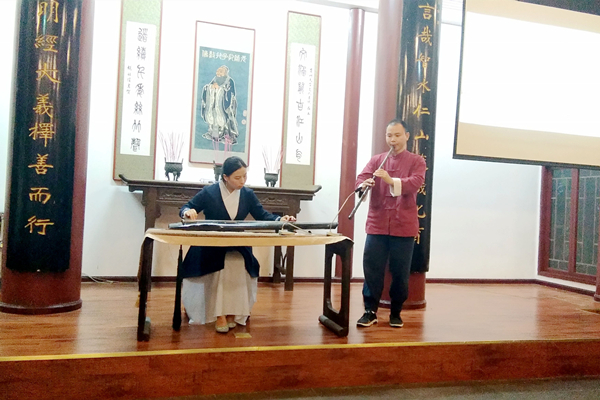“呦呦鹿鸣,食野之苹,我有嘉宾,鼓瑟吹笙”活动以全体社员齐奏合唱《鹿鸣》为始,以独奏、琴歌、琴箫合奏三种古琴演绎方式展开。表演曲目以虞山派吴门卫家理先生所著《侍琴斋琴谱》为主,琴风淳朴无华、飘逸雅致、含蓄悠远、细韵动人。琴歌《知音》婉转动人,琴箫合奏的《关山月》苍凉古朴,意境深远;张连顺老师一曲《忆故人》表现了其深厚的古琴底蕴,将听众带入了绵绵思念之中,琴社社长晏忠涛一曲《四月八》,表现了苗族同胞欢度佳节的喜庆。雅集中还有表现生机盎然、欣欣向荣景象的《春晓吟》;优哉游哉、潇洒自在,曲小意深的《双鹤听泉》等。一首首名曲,为大家精心打造了一场听觉盛宴。最后在一曲表达淡泊名利的曲子《渔樵问答》中结束本次雅集活动。