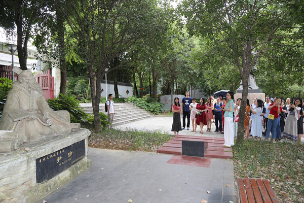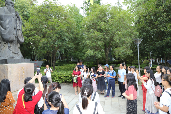 在书院大门外,办公室助理向客人详细介绍了汤恩佳博士所赠送的孔子像及其所象征的传统文化,随后又向客人介绍了尹珍像、贵山书院碑刻等。