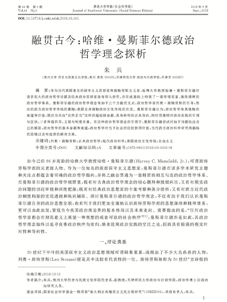 2018年第44卷第5期《西南大学学报》(社会科学版)刊载贵州大学历史与民族文化学院(中国文化书院)历史系教师、天津师范大学政治与行政学院政治学博士后流动站研究人员朱兵副教授国家社会科学基金一般项目“意大利古典精英主义民主观研究”(16BZZ004)成果,题:“融贯古今:哈维·曼斯菲尔德政治哲学理念探析”。全文如下: