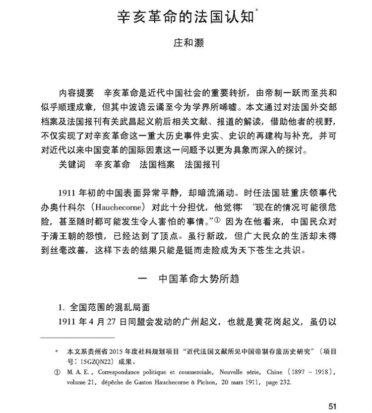 2018年第19辑《近代史学刊》刊载贵州大学历史与民族文化学院(中国文化书院)历史系庄和灏副教授贵州省2015年度社科规划项目“近代法国文献所见中国帝制存废历史研究”(项目号: 15GZQN22)研究成果,题:辛亥革命的法国认知。全文如下: