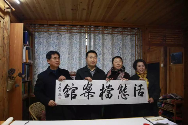 随后,周兴禄教授一行来到了盘信镇大湾村,在参观过程中了解了大湾活态档案馆的建设情况及苗乡民俗风情,并为大湾活态档案馆门牌石的安放地址提出了宝贵建议。参观结束后,为大湾活态档案馆、大湾活态档案馆主陈列室题字。
