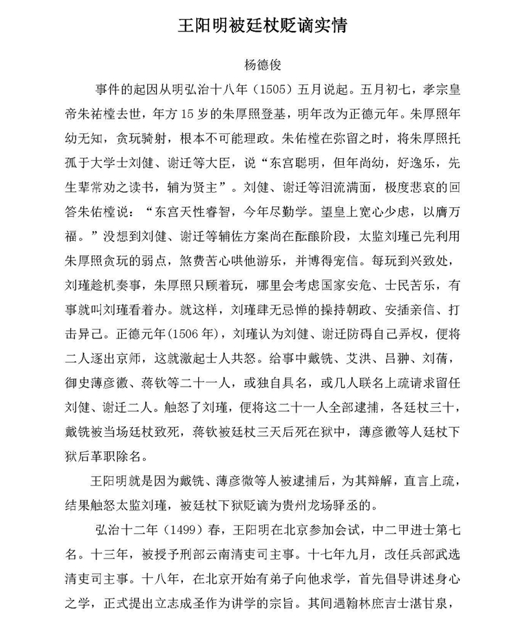杨德俊:王阳明被廷杖贬谪实情